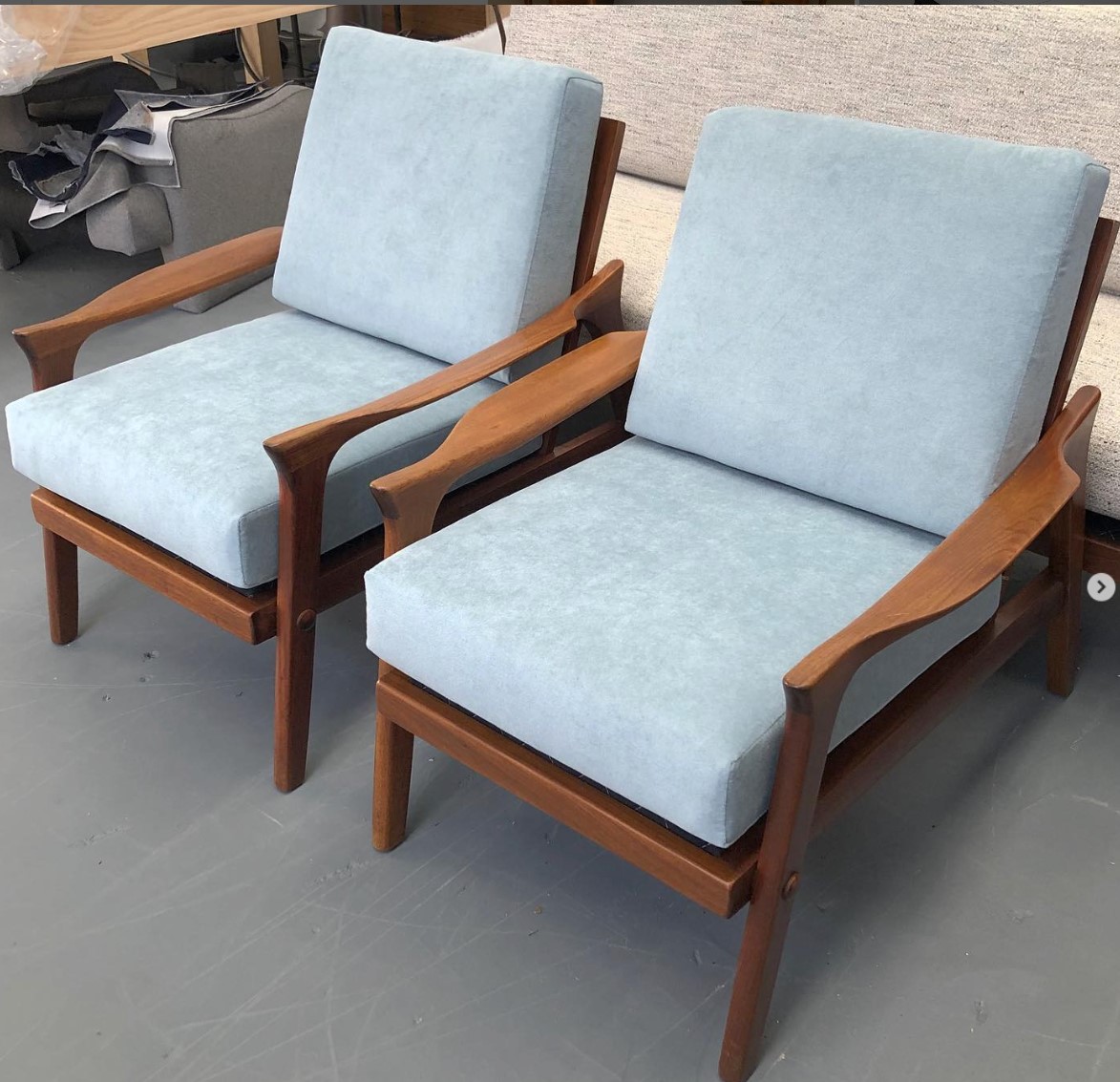 Restoration, reupholstery and recover two mid-century chairs for Manon from East Ryde. Fabric is Peak Duckegg from Zepel..